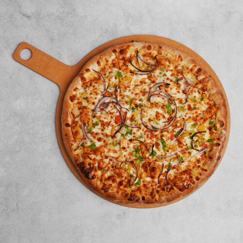Pizzasaus, mozzarella, kip, ui, jalapeno's, paprika.
