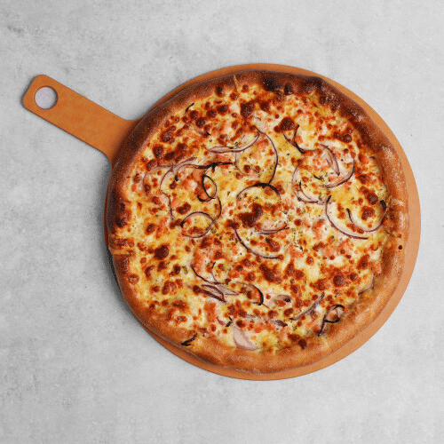Pizzasaus, mozzarella, scampi, paprika, ui.